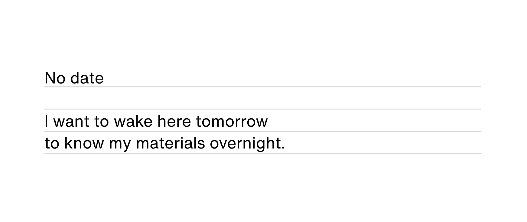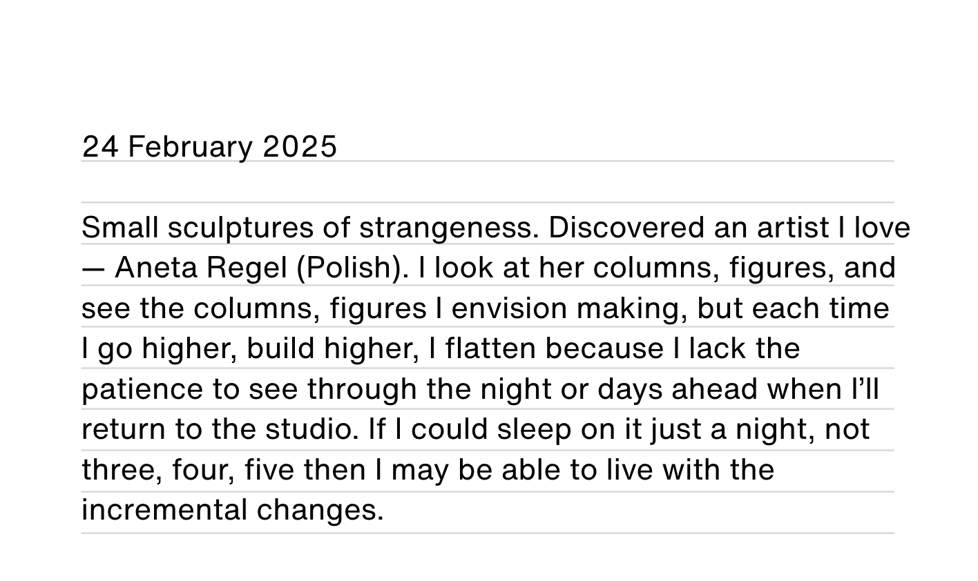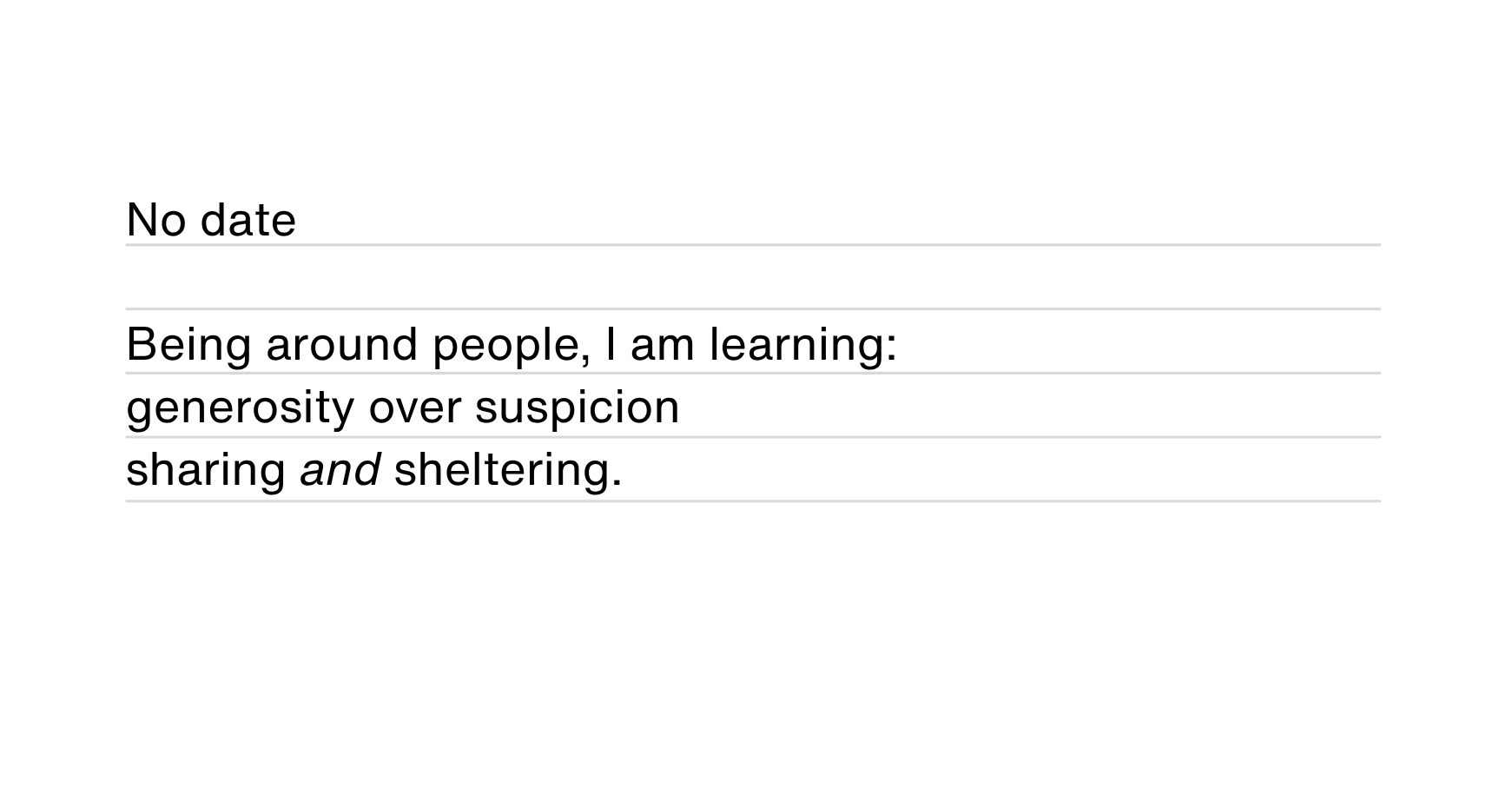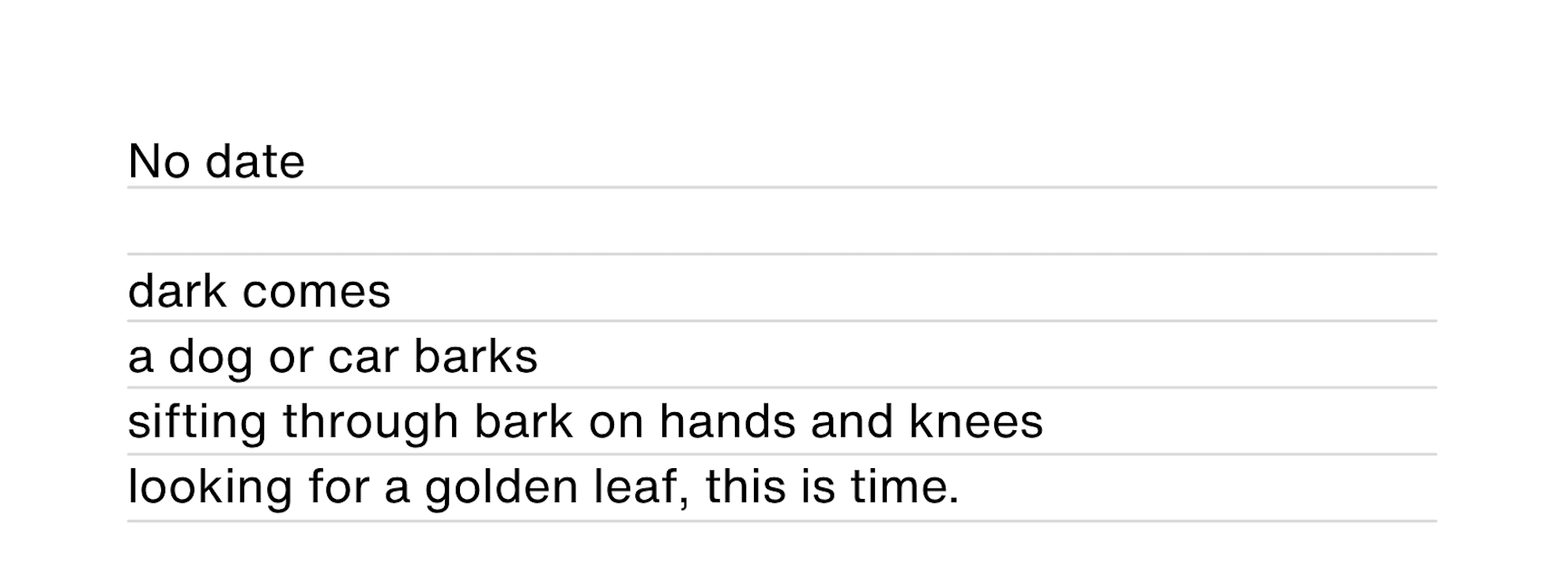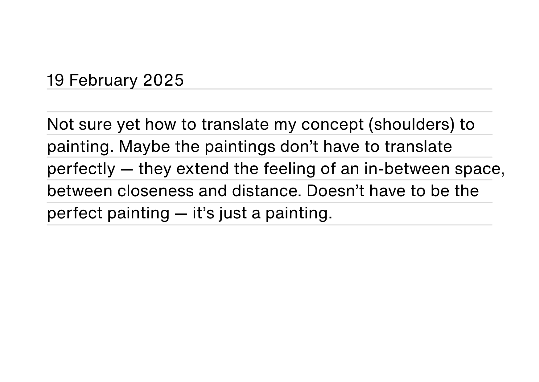 My first four weeks of the residency were spent engaged in research about these artists, their methods, critique and corresponding philosophies alongside my autobiographical writing practice (poetry and prose), which dealt with themes of intimacy, isolation and artistry. I documented these relationships between my practice and research in journal entries, which continued to feed into writing, further research — and so the process went. You’ll see some of my journal entries on this page.