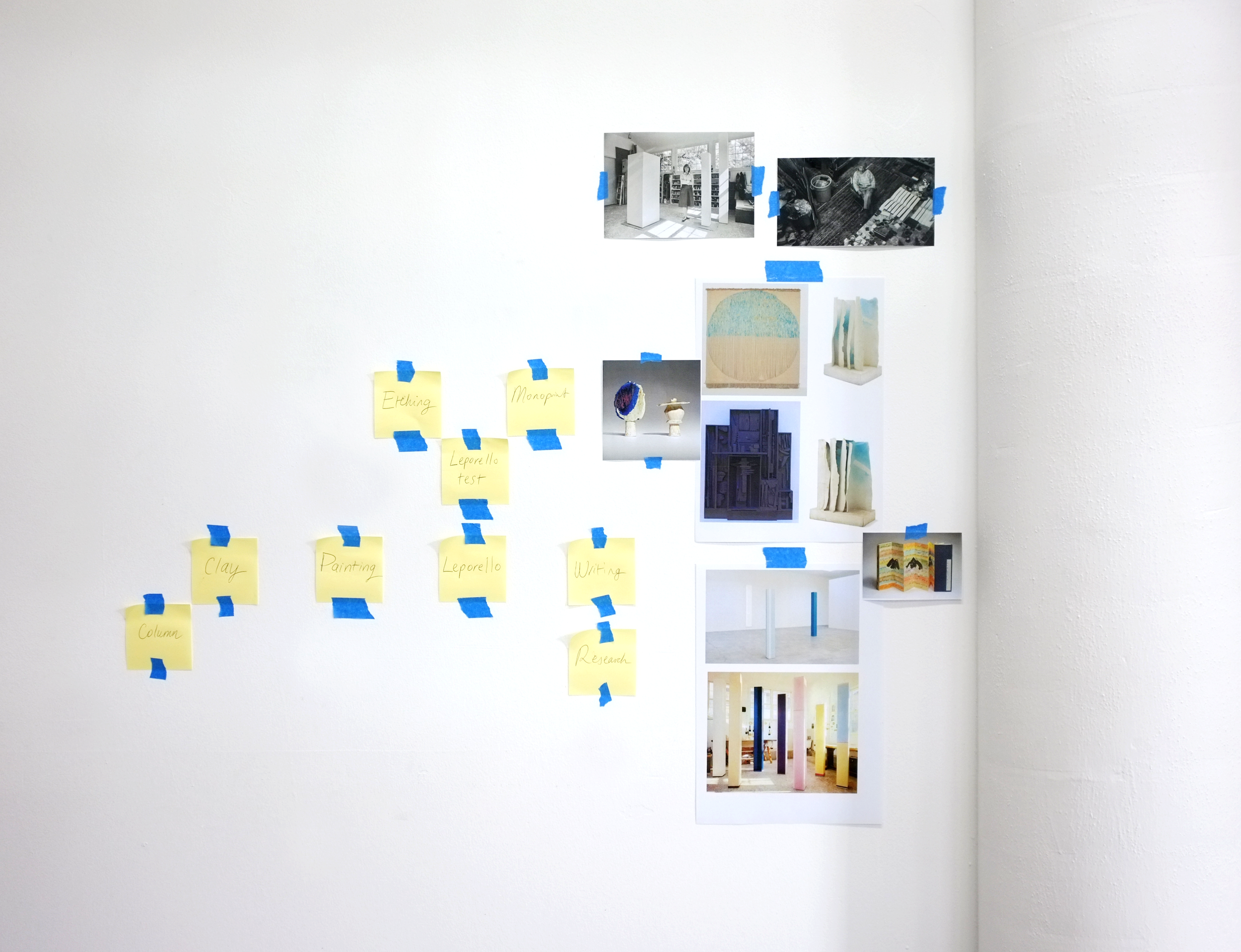 Above: My studio wall, showing post-it notes and images mapping the early stages of concept development and inspiration. I identified four modes of working with and synthesising my ideas: clay, painting, leporello books and writing/research.