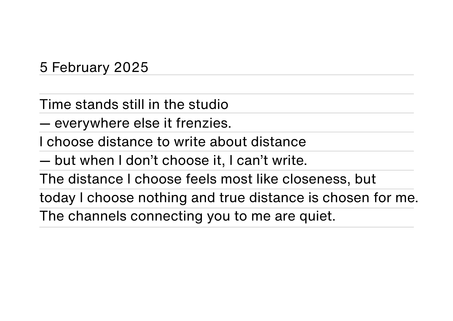 My first four weeks of the residency were spent engaged in research about these artists, their methods, critique and corresponding philosophies alongside my autobiographical writing practice (poetry and prose), which dealt with themes of intimacy, isolation and artistry. I documented these relationships between my practice and research in journal entries, which continued to feed into writing, further research — and so the process went. You’ll see some of my journal entries on this page.